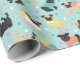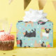 Cute birthday party Pug dogs with black and tan coats dressed in cute birthday outfits with balloons, cake and confetti pattern.