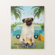 Pug Dog sitting near camp file and tent with camper van in background on riverside is a perfect garden flag if you are going for camping.
