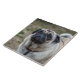 A beautiful photograph of a cute pug dog printed on a ceramic tile.