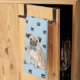 An adorable little Pug dog wears a bow tie at one end of this cute kitchen towel. The dog image is placed on a black paw print and light blue background. Perfect for anyone who has lost their heart to a Pug!
