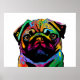 A bright and colourful pop art print of a Pug Dog on a white background.