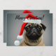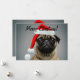 A Christmas card featuring a pug wearing a Christmas hat with Merry Christmas typography.