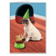 Pug with tongue sticking out green party hat birthday cake and candles doggy bed in background