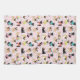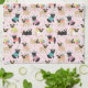 Cute birthday party Pug dogs with black and tan coats dressed in cute birthday outfits with balloons, cake and confetti pattern.