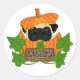 Pumpkin on a vine with a cute Pug dog inside the Pumpkin. A wooden sign in the Pumpkin patch says Pugkin Patch. Cute Halloween items, clothing, Halloween invitations, Trick or Treat bags and more for Pug Lovers!