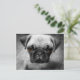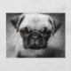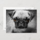 Black and white photograph of a very cute pug puppy with big shiny brown eyes and floppy little velvety ears.