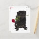 Brighten someone's day with handwritten note! This fun canine postcard features an image of a black Pug puppy dog with a rose in his mouth highlighted against a creamy white background.
