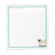Make a great gift for pug lovers or something special for yourself. Our custom Pug and Roses design gives you room to personalise the pages of this pad to include your name, nickname, or your own slogan. The teal coloured border can be changed to a colour of your choice. Click on the Customise It button to see a palate of background colours. If you prefer an unlined version, you can clear the image that contains the lines. Use this notepad for writing, jotting, doodling or drawing. The image in the lower right corner shows a fawn pug holding a couple of roses in its mouth.