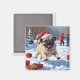 A playful Pug runs through the snowy winter scene, wearing a festive red Christmas hat. This charming design highlights the breed’s wrinkled face, loveable personality, and joyful spirit while capturing the warmth and magic of the holiday season. A delightful winter moment full of festive cheer.