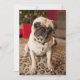 Pug sitting on carpet, Christmas tree Holiday Card