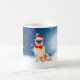 A beautiful photo of pug wearing a Christmas Santa hat and sat in snow. A perfect christmas gift for someone who loves pug or own this dog breed.