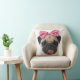 Pug dog with tongue out with a sequined pink ribbon, white background.