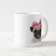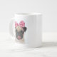 Pug dog with tongue out with a sequined pink ribbon, white background.