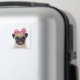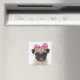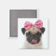 Pug dog with tongue out with a sequined pink ribbon, white background.