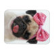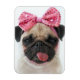 Pug dog with tongue out with a sequined pink ribbon, white background.