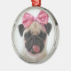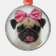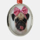 Pug dog with tongue out with a sequined pink ribbon, white background.
