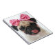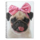 Pug dog with tongue out with a sequined pink ribbon, white background.
