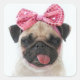 Pug dog with tongue out with a sequined pink ribbon, white background.