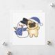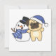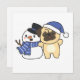 Pug with snowman in winter for Christmas - a snowman for winter and Christmas. A winter greeting in the cold season for the holidays. Christmas pug with snowman.