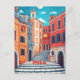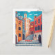 This travel postcard showcases a whimsical illustration representing historic narrow streets of Pula, Croatia.
