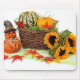 Adorable pumpkin with a basketful of gourds and pretty sunflowers.