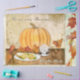 Celebrate the fall season with pumpkin spice roll and lattes! Original Art by Audrey Jeanne Roberts has a beautiful aqua blue swirl water colour background, a soft aqua blue paisley design background, with falling red, orange and gold autumn leaves, border, a pumpkin with additional leaves and tan swirled background with a pumpkin roll and a cup of cappuccino with whipped cream. All of this design in in a collage format collaged together along with the original Audrey Jeanne saying "For our many blessings, we give thanks."