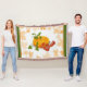 Pumpkin berries, leaves fall Happy Thanksgiving throw blanket. It features a yellow, orange pumpkin with leaves, red berries and maple leaves in autumn colours accented with green borders.