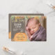 Sweet little pumpkin fall baby birth announcement and thank you card. This versatile baby birth announcement with full colour baby photo, doubles as a thank you card with lots of open space to write a personal thank you note on the reverse side.. Hello Baby text and pretty fall foliage decorate this photo baby birth announcement with wood look background. <i>Photography © Storytree Studios, Stanford, CA</i>
