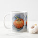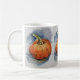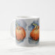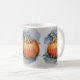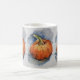 A lovely watercolour Pumpkin in shades of orange with a blue background.