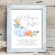 Cute diaper raffle drop off sign for your baby boy shower that features "diaper raffle" in a pretty script with a heart swash and a watercolor of a pastel blue pumpkin, florals and greenery. Personalise the diaper raffle instructions in simple grey typography.