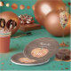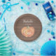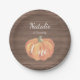 Pumpkin Fall First Birthday Party Paper Plates. Rustic Wood Background.