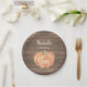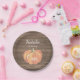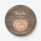 Pumpkin Fall First Birthday Party Paper Plates. Rustic Wood Background.