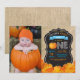Pumpkin First Birthday Invitation with custom photo, orange, blue and burlap background. For further customisation, please click the "Customise it" button and use our design tool to modify this template.