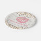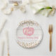 Pumpkin Fall First Birthday Party Paper Plates. Pink and Gold Glitter Confetti Background.