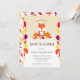 A fox pumpkin baby shower invitation featuring a little fox and two pumpkins with colourful Fall leaves. Simply customise the text, add these invites to your cart, and have a wonderful baby shower.