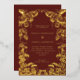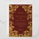 An elegant fall wedding invitation with a frame of hand drawn pumpkins and leaves in real gold foil on a burgundy background. Personalise with your details in gold.