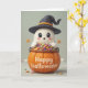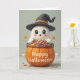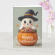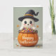 Send ghostly cuteness with this Halloween card featuring a ghost popping out of a pumpkin, complete with a tiny witch hat. Sweet and spooky fun!