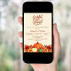 A soft beige background. Decorated with pumpkins and orange and yellow flowers. Personalise and add the party details.