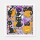 Cute black cats amongst pumpkins, halloween candy, bats, broom, stars, candy corn, acorns, full moon, autumn leaves and a cut ghost all set in a backdrop of light purple