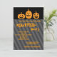 Fun and modern Halloween party invitation. Appropriate for any age. Features three pumpkins on a black background and dark grey stripes. Add your own wording.