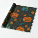 A festive Halloween design featuring glowing jack-o’-lanterns, eerie haunted houses, swirling bats, and autumn leaves. Bare trees and teal swirls add a mystical touch, creating a spooky yet playful atmosphere perfect for seasonal wrapping paper, décor, and craft projects.