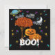Halloween Invitation Featuring a Black Sky, Crescent Moon, Colorful Saturn, Clouds and more colorful stars abound. Cute Pumpkin Family standing next to a tree with orange fall color Leaves and a Big BOO! With eyes atop the letters all inviting you to a most but not too spooky Halloween Harvest Party. Perfect for the Church Harvest Halloween Party too!