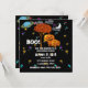 Halloween Invitation Featuring a Black Sky, Crescent Moon, Colourful Saturn, Clouds and more colourful stars abound. Cute Pumpkin Family standing next to a tree with orange fall colour Leaves and a Big BOO! With eyes atop the letters all inviting you to a most but not too spooky Halloween Harvest Party. Perfect for the Church Harvest Halloween Party too!