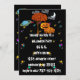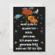 Halloween Invitation Featuring a Black Sky, Crescent Moon, Colorful Saturn, Clouds and more colorful stars abound. Cute Pumpkin Family standing next to a tree with orange fall color Leaves and a Big BOO! With eyes atop the letters all inviting you to a most but not too spooky Halloween Harvest Party. Perfect for the Church Harvest Halloween Party too!