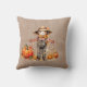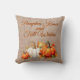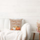 Rustic watercolor Fall pillow has a tan woven background with a beautiful arrangement of fall pumpkins and colourful foliage. Typography is done in orange with a black background to make the lettering stand out. Reverse side of pillow is a whimsical scarecrow standing amongst pumpkins. Background is also a faux tan woven material.