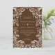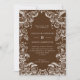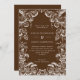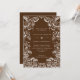 An elegant fall wedding invitation with a frame of hand drawn pumpkins and leaves in white on a autumnal brown. background. Personalise with your details.