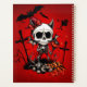 Pumpkin Magic and Bone Fun. Amidst a grim cemetery setting, a cheerful cartoon skeleton stands perched on a pile of weathered stones. The skeleton, with its bony limbs and mischievous grin, wears a striking red bow around its neck and has pointed devil horns that give it a playful yet mischievous expression. In its right hand, it proudly holds a glowing pumpkin-shaped lantern on a long stick, whose warm light gently radiates into the surroundings. The background of the design is a vibrant red that underlines the festive spirit of Halloween.