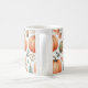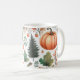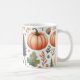 A pumpkin pattern mug featuring a watercolor autumn design with falling leaves. Perfect for pumpkin spice latte lovers or as a cute seasonal decoration.