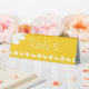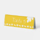 This table tent sign features a bright yellow background with a stripe of pumpkin and oak leaf silhouettes decorating it along the bottom and a single oak leaf in the upper corner. Plenty of space is left above the bottom band for you to fill in the table number or other information, so that seating can go more smoothly at your autumn-themed wedding. Be sure to check out the full Pumpkin Patch in Yellow collection to find more products, including invitations, guest books, napkins, and even favour boxes, with matching designs that will allow for a truly coordinated wedding or special event.