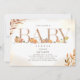 Neutral boho baby shower theme with "BABY" lettering in wood inspired faux texture decorated with pumpkins, vines, and leaves with leaves at corners. Background is watercolor inspired. Reverse side is terracotta colour.